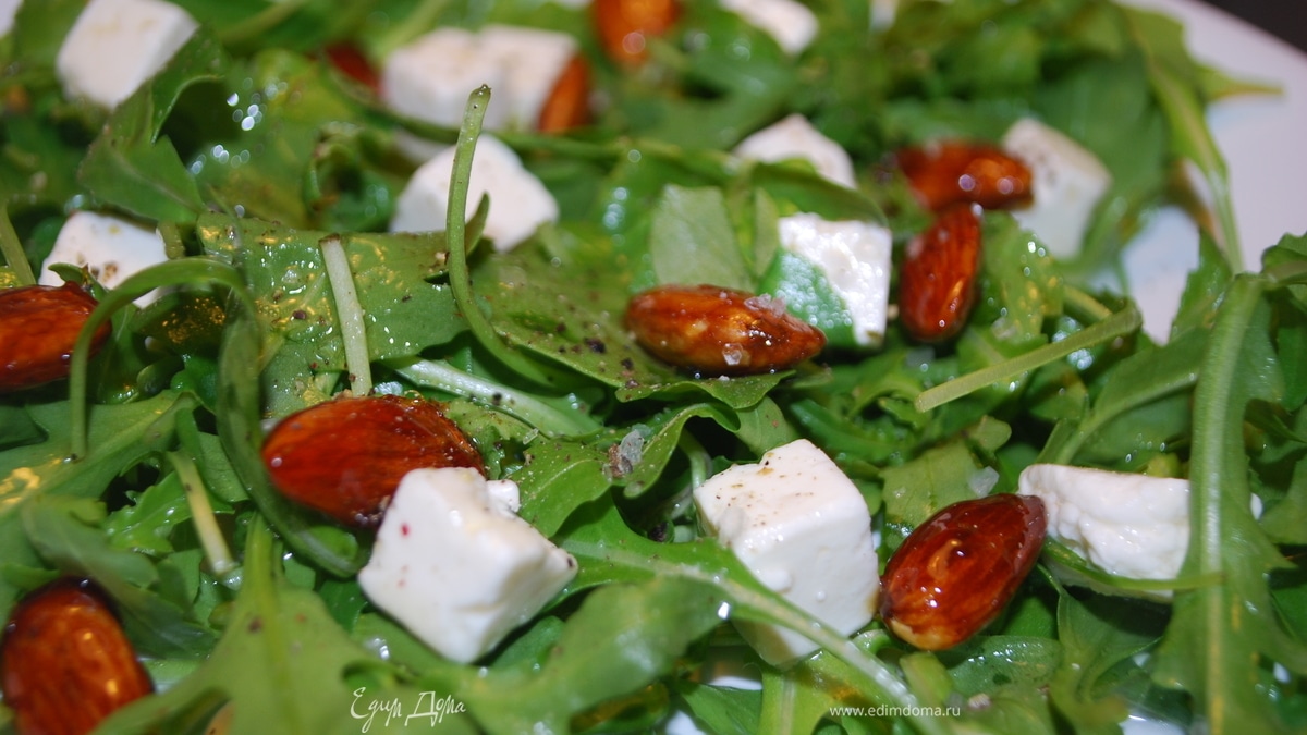 - Шаг 1Листья руколы сбрызнуть соком лимона, миндаль на сковородку, добавить ложку мёда, довести до глазури,сыр режем средними ломтиками. Соус: половину столовой ложки мёда и лимонного сока смешать с оливковым маслом. листья руколы + миндаль + сыр + соус + немного свежемолотого перца и морской соли Приятного и удачи!!!