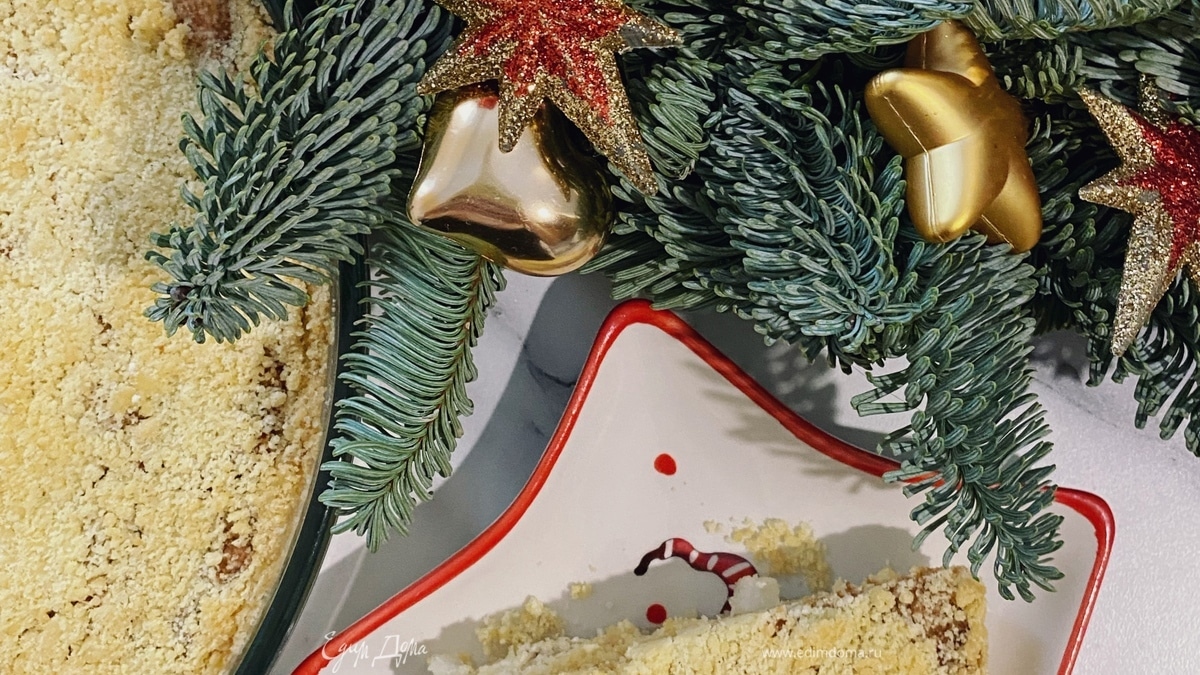 В форму высыпаем 2/3 крошки, слегка утрамбовывая ко дну и бортикам. Далее — начинка. Сверху покрываем еще 1/3 крошки (не придавливаем).