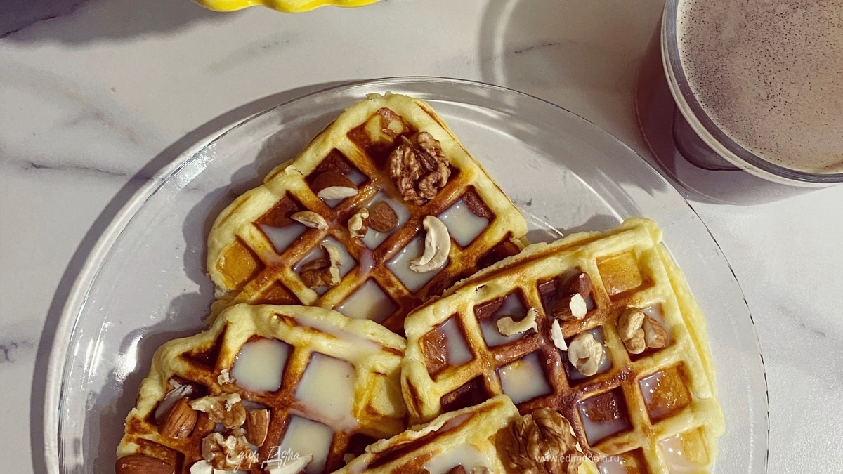 Выпекаю три партии по две вафли, на каждую уходит минут 5–6. Подаем со сметанкой или вареньем, с любыми ягодами. У меня сегодня сгущенные сливки и орехи. Приятной готовки и восхищенных вашими кулинарными шедеврами близких!