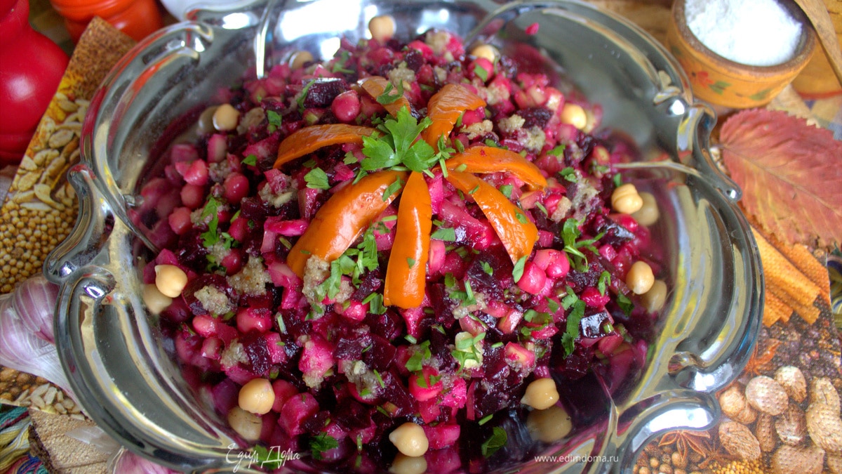 Всем знакомый винегрет приготовим по-новому. Мужчины оценят в нем курочку, а ваши гости удивятся нетрадиционному для большинства продукту — нуту. Мне он нравится, поэтому отвариваю сразу побольше и использую в приготовлении блюд и просто так!