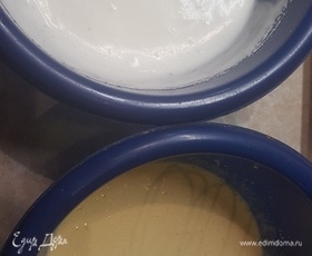 Отделить желтки от белков. Белки с половиной сахара взбить до мягких пиков. Желтки взбить с оставшимся сахаром в пышную массу.