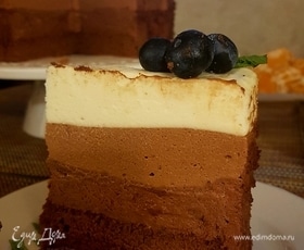 Холодные сливки взбить и соединить с шоколадной массой. Бисквит поставить в разъемную форму. Стенки проложить ацетатной лентой. Вылить сверху мусс из горького шоколада и поставить в холодильник для застывания. Пока готовятся следующие слои, он успеет схватиться. Аналогично готовятся муссы из молочного и белого шоколада. Готовый торт поставить на ночь в холодильник, чтобы он полностью застыл.