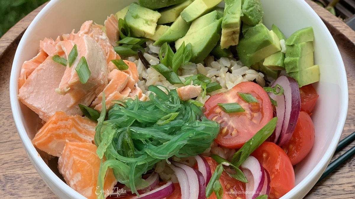 - Шаг 3Собираем боул. Рис выкладываем в центр, по краям тарелки — авокадо, лук, чуку, помидоры и рыбу. Посыпаем измельченным зеленым луком, при желании можно посыпать кунжутными семечками. В качестве заправки используем оливковое масло, смешанное с лимонным соком.
