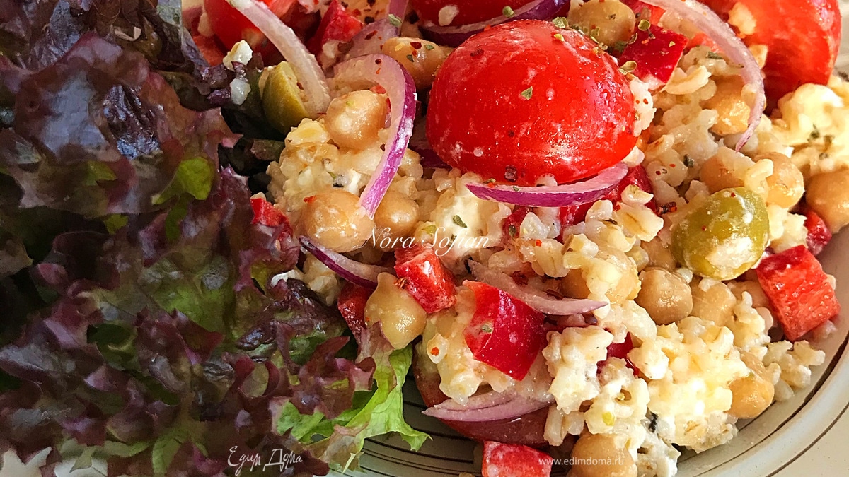 В салатницу переложить нут, добавить булгур, овощи, чеснок, оливки и сыр (он у меня мягкий, я его слегка раскрошила). - Шаг 3