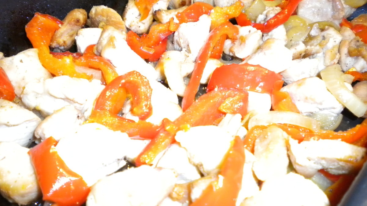 - Шаг 3Нарезаем перец соломкой и добавляем его к курице.