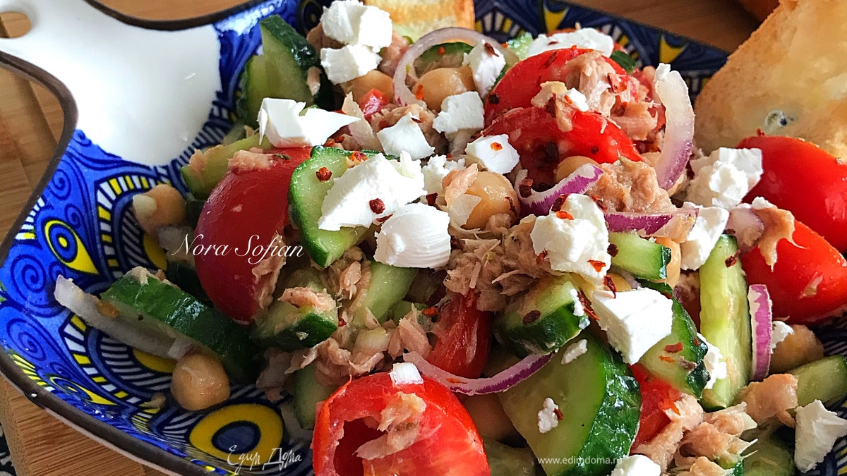 Тунец у меня в собственном соку, поэтому я добавила в салат оливковое масло. Если у вас тунец в масле, то, думаю, масло добавлять уже не надо. Итак, с тунца слить жидкость и размять вилкой. Черри разрезать пополам, огурцы и лук крупно нарезать, а чеснок — мелко. В салатницу переложить нарезанные овощи, нут и рыбу. Добавить специи, лимонный сок, масло и аккуратно перемешать. Дать салату настояться 10 минут. - Шаг 2