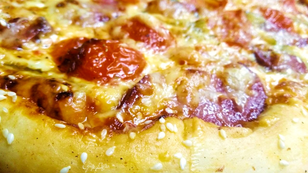 - Шаг 4Запекать в духовке 12 минут при 200°C, режим «пицца» (нижний нагрев + горячий воздух). Вот такую пиццу я пеку для своей семьи. Возможно, рецепт понравится и вам! Желаю приятного аппетита.