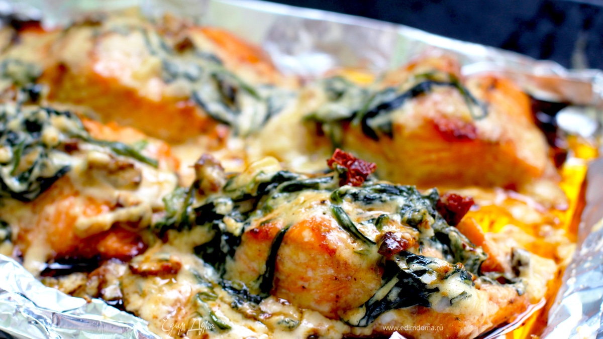 Духовку разогрейте до 210°C, запекайте рыбу 15–17 минут. Промойте шпинат, отрежьте ножки у корня, обсушите. В сковороде разогрейте масло с чесноком. Как только оно начнет шипеть, добавьте шпинат и, помешивая, тушите до увядшего состояния. Добавьте сливки, приправьте солью и перцем и доведите соус до кипения. Проварите минуту, добавьте нарезанные вяленые помидоры. - Шаг 3