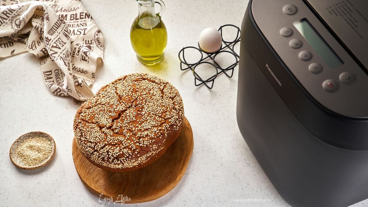 Когда замес закончится (на дисплее — «1:30»), лопаткой разровняйте тесто и посыпьте сверху кунжутом.