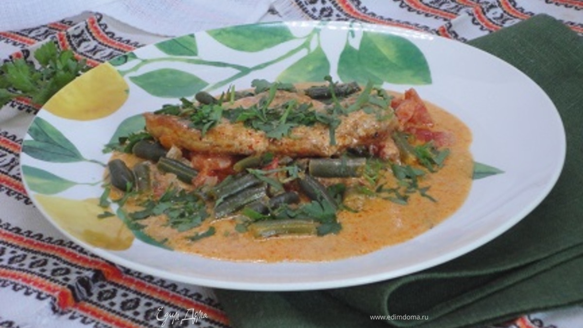Если вы используете свежую, а не замороженную фасоль, очистите ее и нарежьте кусочками по 2 см. Замороженная фасоль готова к употреблению без разморозки. Готовое мясо выньте из соуса и положите вместо него фасоль. Добавьте столько воды, чтобы она покрыла овощи. Посолите, поперчите и тушите до готовности фасоли. Сметану смешайте с оставшейся мукой (около 1 ст. л.) и добавьте к овощам. Немного покипятите, чтобы загустить соус. - Шаг 5