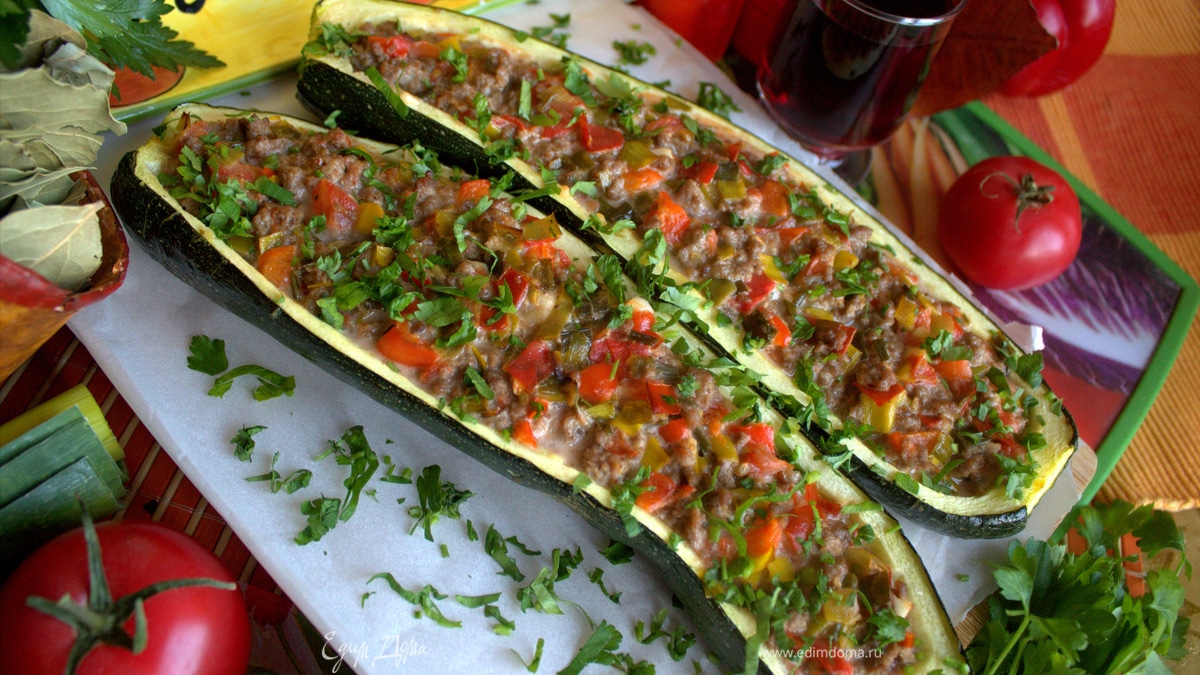 Сейчас круглый год можно найти в магазинах молодые кабачки, цукини. Не откажем себе в удовольствии приготовить фаршированные лодочки на ужин. Фарш со сметаной получается сочный, кабачок не пересушен. Нет фарша — замените на грибы, ветчину, бекон... Подобные кабачки готовила мама часто в детстве, правда, только в сезон. Совсем немного начинки — и сытное блюдо готово. Угощаю своего мужа в праздник 23 Февраля!