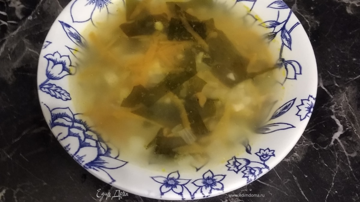 Когда бульон готов, опустить картофель, через 10 минут — булгур, зажарку из лука и моркови, еще через 10 минут — вакаме. Варить до готовности картофеля и булгура. Суп готов. Приятного аппетита!
