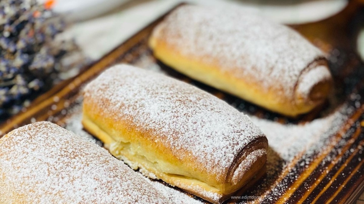 - Шаг 3Раскатать тесто в прямоугольный пласт, обрезать неровности и нарезать на прямоугольники. В начало каждого уложить начинку и свернуть рулетиком.