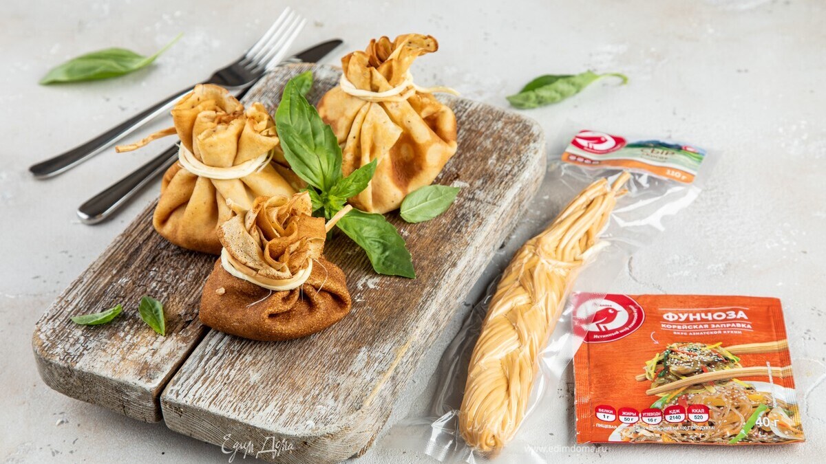 На середину блина выложите курицу с фунчозой. Получившейся начинки хватает на 10–12 блинов. - Шаг 8