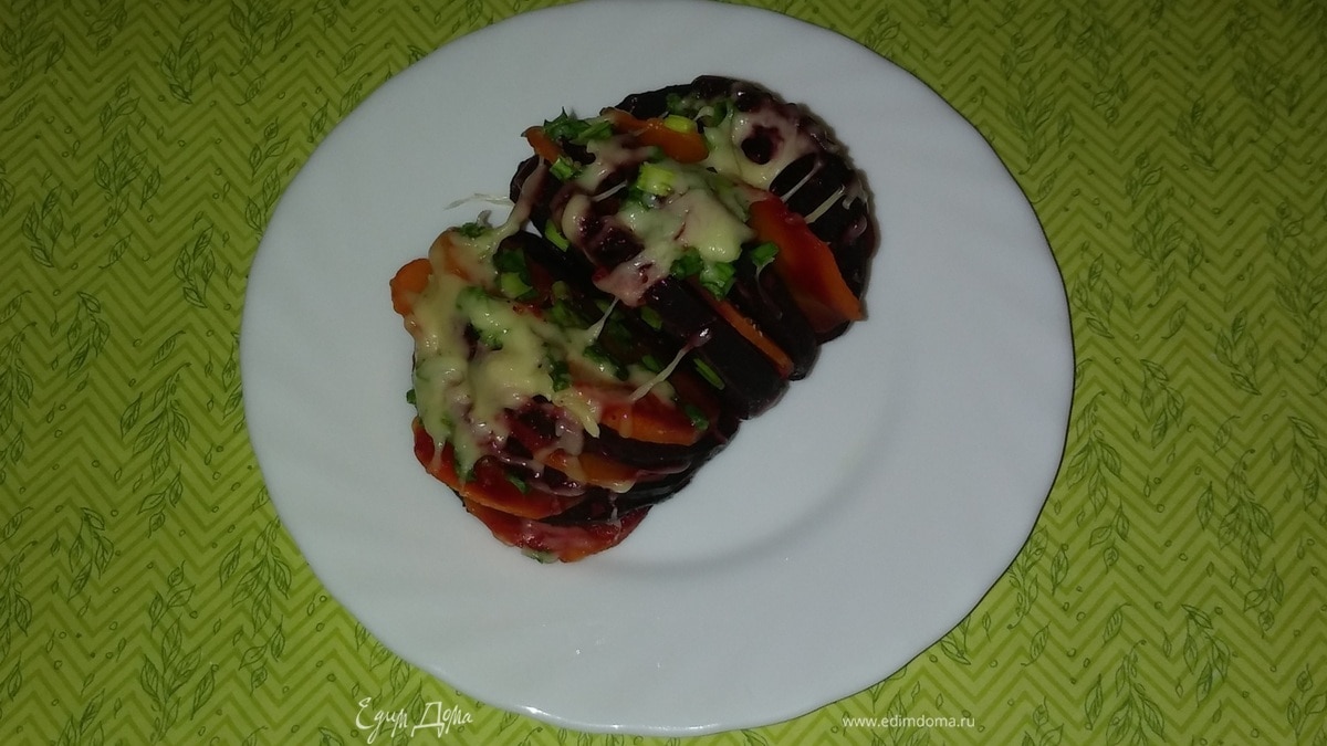 Свекла, фаршированная морковью, под сырно-луковой шапкой