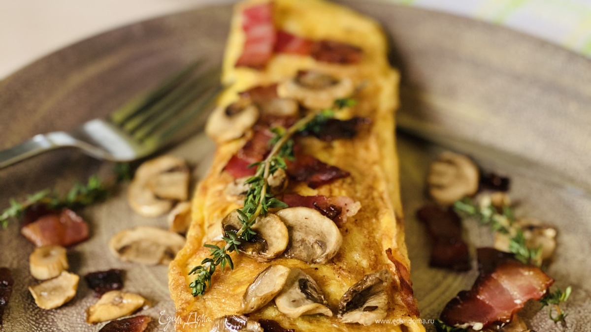 - Шаг 4Переложить на тарелку, посыпать второй частью бекона с грибами и петрушкой.