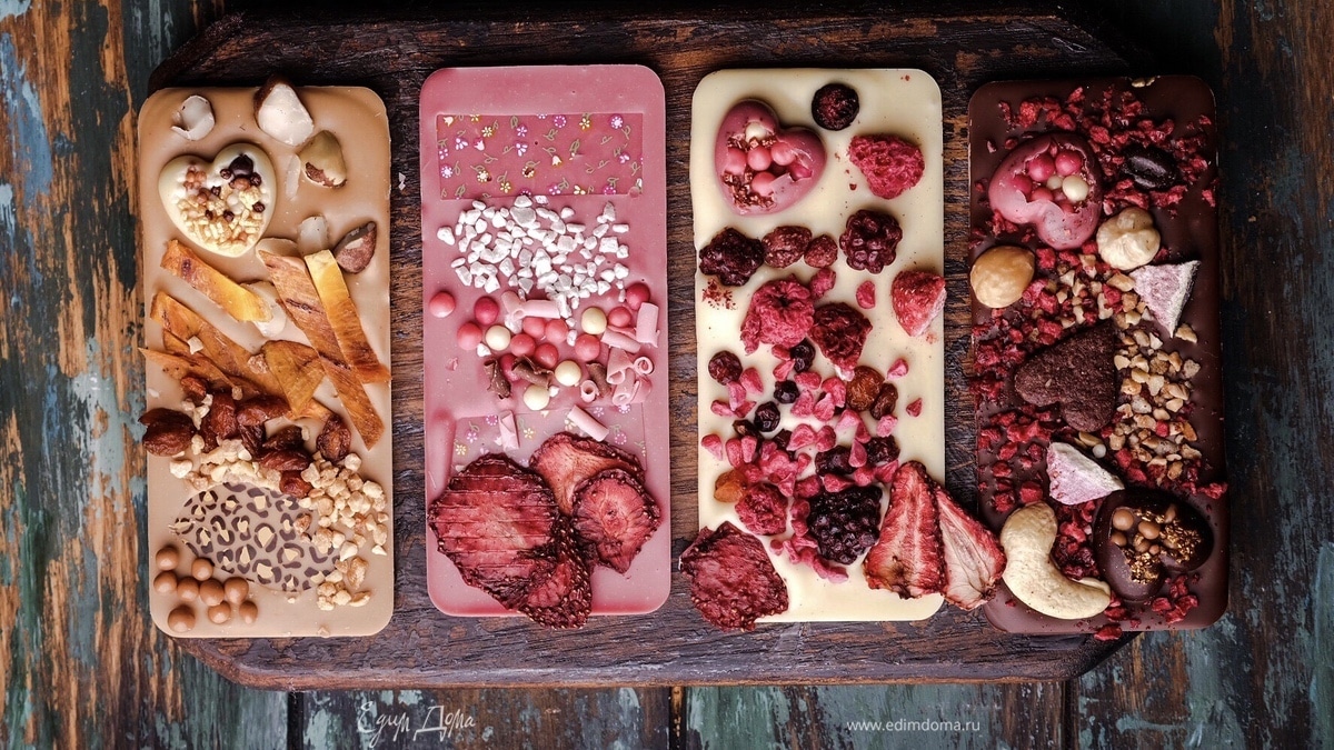 10. Начинка. В качестве начинки можно брать практически все, что вы любите: орехи, сухофрукты, сублимированные ягоды и фрукты, хрустящие шоколадные кранчи, вафельную крошку, шоколадные фигурки и многое-многое другое. Важно — начинка должна быть сухой, поэтому свежие ягоды и фрукты, конечно, добавлять в плитки нельзя.