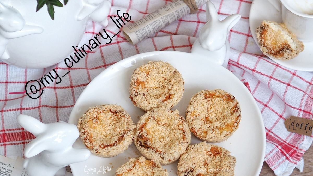 Для начинки смешать венчиком все ингредиенты, слегка взбить. Будет жидкая консистенция. Духовку разогреть до 180°C, режим верх/низ. Нужна форма для кексов, ее не смазывать, руками утрамбовать тесто в виде корзинок. На это уйдет 3/4 теста (крошки), наполнить начинкой до верха.