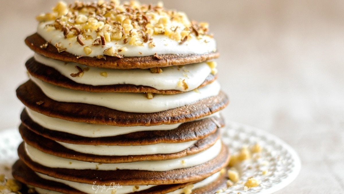 Шоколадные панкейки пропитанные сметанным кремом, а аромат орехов какой! Вот так простые панкейки превращаются в настоящий праздничный десерт.