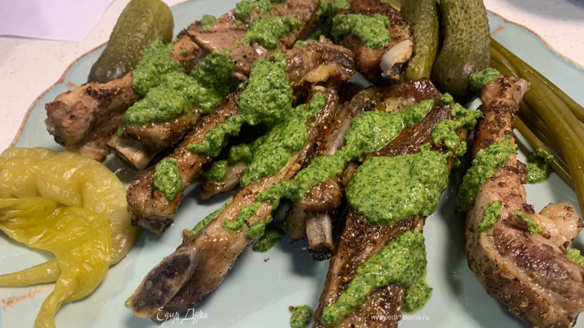 Запеченные свиные ребрышки с черемшой, солеными огурцами и сальсой верде