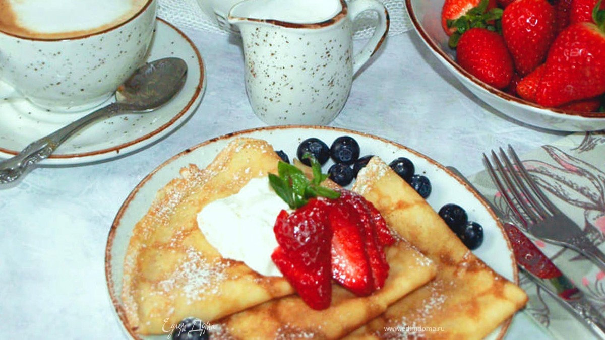 Невероятно вкусные блинчики от кондитера Александра Селезнева. Пропорции ингредиентов безупречны. Блины получаются очень тонкими и хрустящими по краям. Если не добавлять сахар, то изделия прекрасно подойдут для соленой начинки. Подать блины я хотела бы на десертных тарелках от Luminarc.