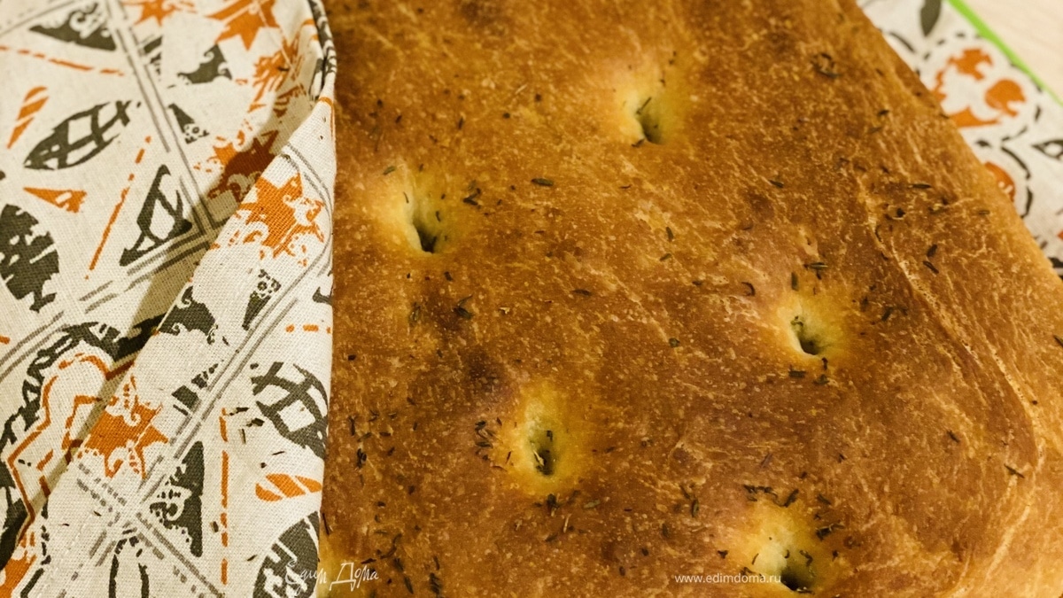 Аккуратно при помощи пальцев сделать в тесте вмятины. Смазать оливковым маслом, посыпать тимьяном или розмарином и поставить в разогретую до 180°C духовку. Выпекать до золотисто-коричневого цвета (примерно 20–25 мин).