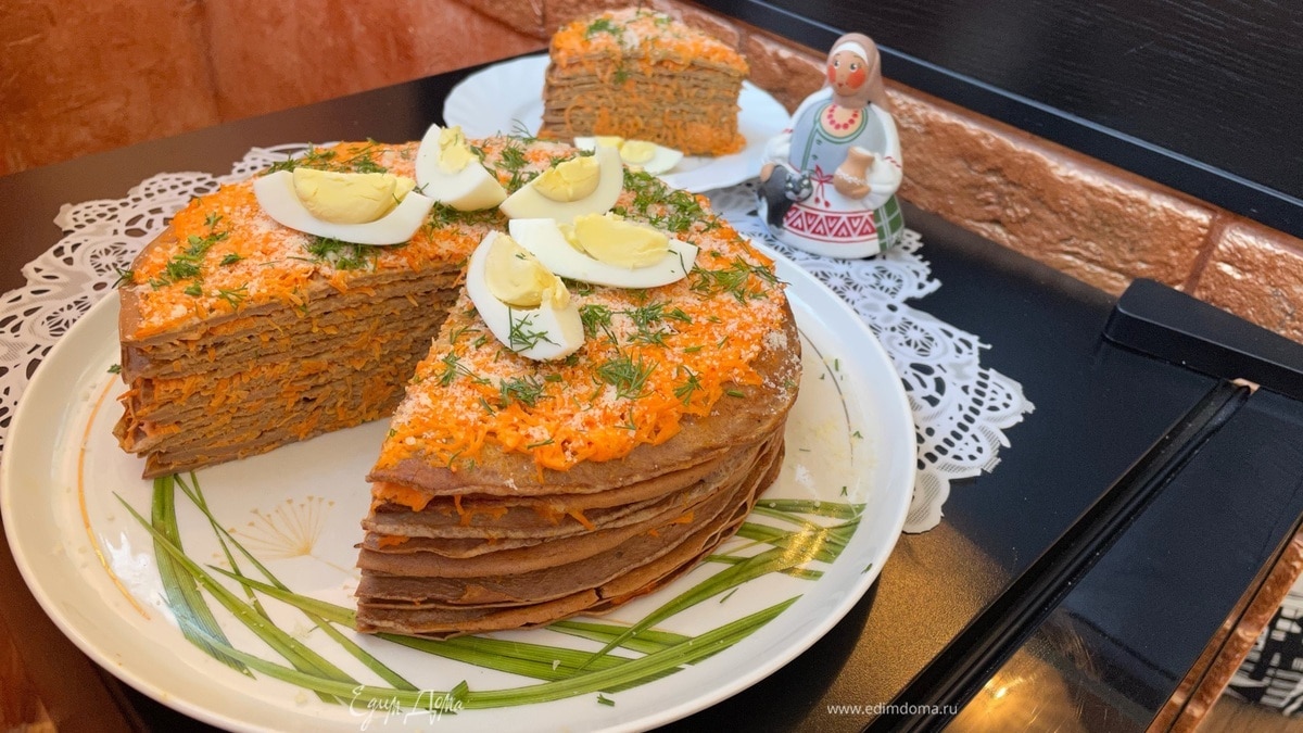 Соберите торт: на первый блин нанесите тонкий слой моркови с чесноком, сверху — второй блинчик. Чередуйте блинчики с начинкой, пока ингредиенты не закончатся. - Шаг 8