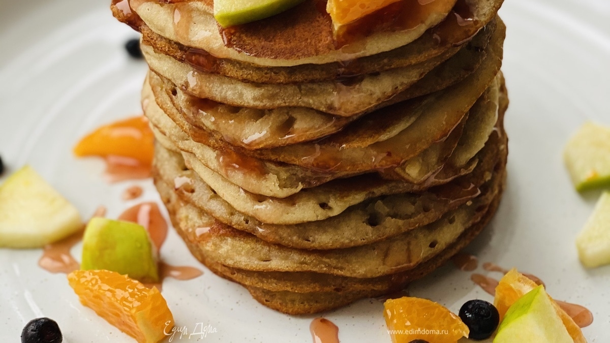 Разогретую сковороду смазываем кокосовым маслом и выпекаем наши постные панкейки. Подаем с любимыми фруктами и медом. Приятного аппетита!