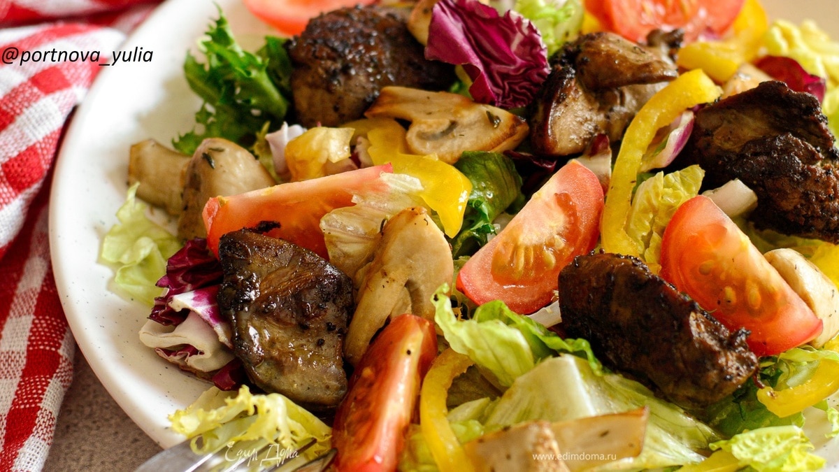 Сытный и очень вкусный теплый салат. Прекрасное сочетание свежих овощей и теплых кусочков печени. Отличный вариант праздничного блюда!