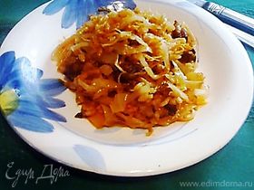 - Шаг 3Лук мелко нарезаем, морковь натираем и обжариваем вместе. В конце добавляем пассату и тушим минут 7.