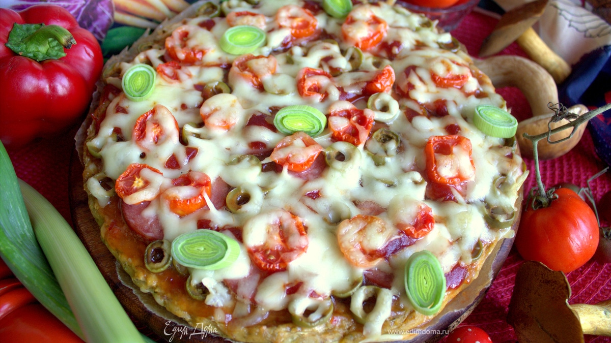 Самодостаточная основа моей пиццы понравится любителям овощей. Можно просто запечь ее под сыром — уже вкусно! Но порадуем наших родных мужчин и приготовим сытный завтрак выходного дня, добавив любимый ими ингредиент — колбаску! У моей знакомой муж открывает холодильник, видит, что нет колбасы, и спрашивает: «А что, у нас нечего поесть?». Другие продукты он не видит.