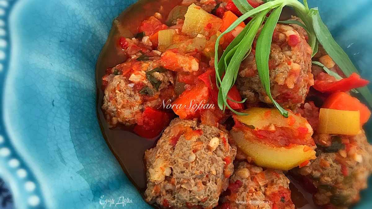 Затем добавляем в овощную подливку полуготовые тефтели, перемешиваем и тушим до готовности тефтелей. В конце добавляем мелко нарезанный тархун, оставшийся чеснок, тушим минутку и снимаем с огня. - Шаг 5