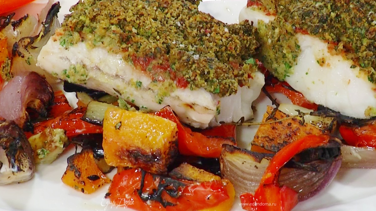 Когда овощи будут почти готовы, выложить на них треску и запекать еще минут 10, до готовности рыбы.