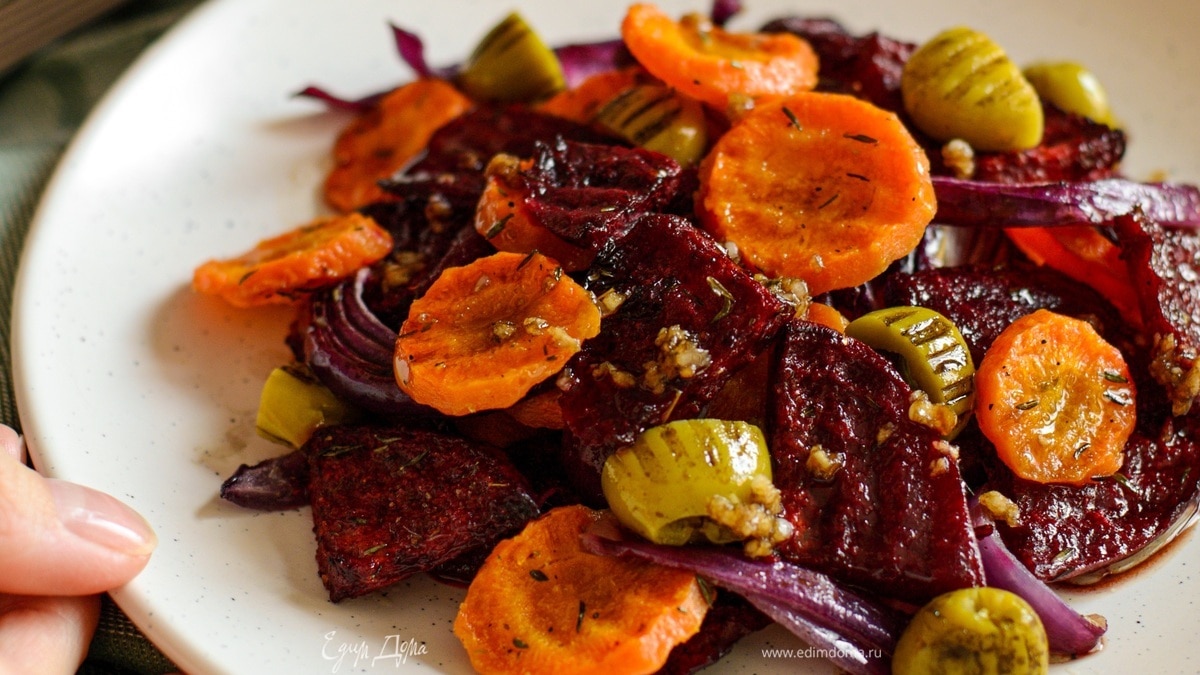 Запеченным овощам даем немного остыть, выкладываем на блюдо. Добавляем оливки. Поливаем заправкой. Подаем теплым. 🍴 Приятного аппетита! 🍴