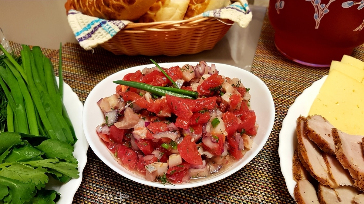 С лука слить воду. Смешать все ингредиенты. Заправить маслом, поперчить и посолить по вкусу. Поставить в холодильник охлаждаться на 30 минут. Подавать лучше всего с тостами.