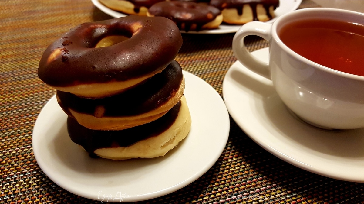 Для глазури в сотейнике растопить масло с молоком, добавить какао и сахар. На маленьком огне готовить до растворения сахара. В глазурь окунуть пончик и оставить на решетке до застывания. - Шаг 7