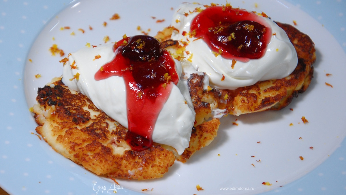 Подавать готовые сырники со сметаной, джемом и цедрой апельсина.