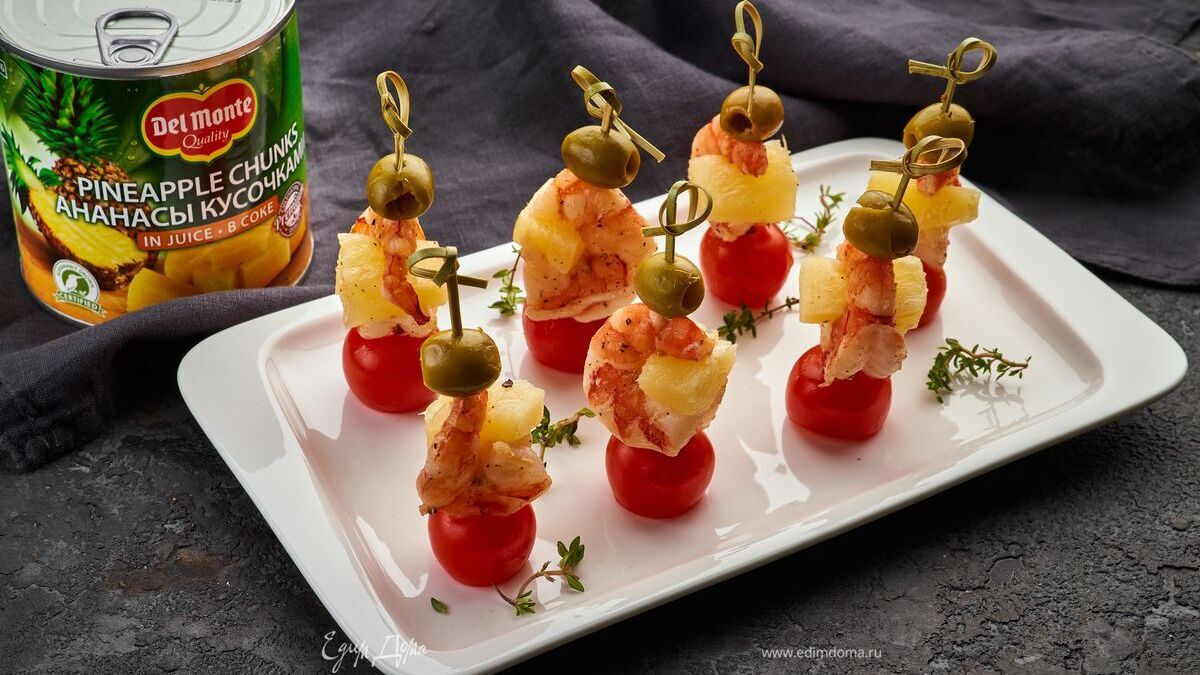 Консервированные ананасы кусочками в соке Del Monte насадите на шпажку вместе с оливками, креветками и помидорами черри. - Шаг 5