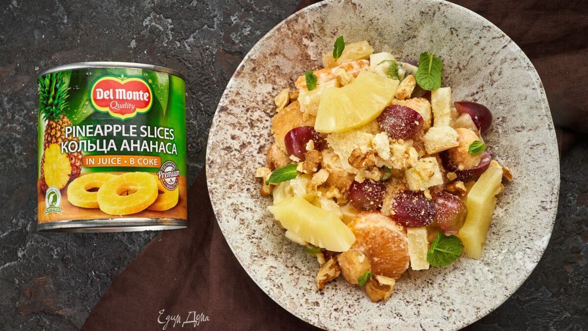 Фруктовый салат с ананасами, йогуртом и печеньем