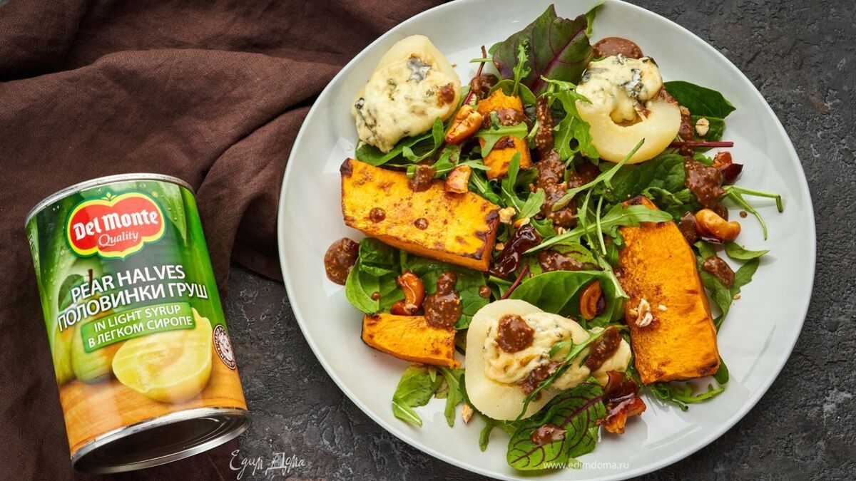 Теплый салат с запеченной тыквой, руколой, грушей и сыром дорблю