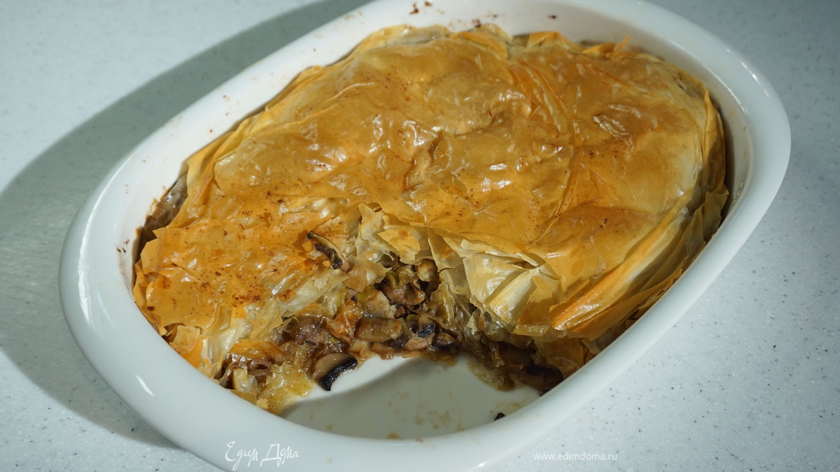В глубокую продолговатую форму для запекания уложить один на другой три листа фило, промазывая их растопленным маслом, сверху выложить начинку, а затем оставшиеся листы фило, так же смазав их маслом. Уголки теста подвернуть внутрь формы и смазать оставшимся маслом. - Шаг 10