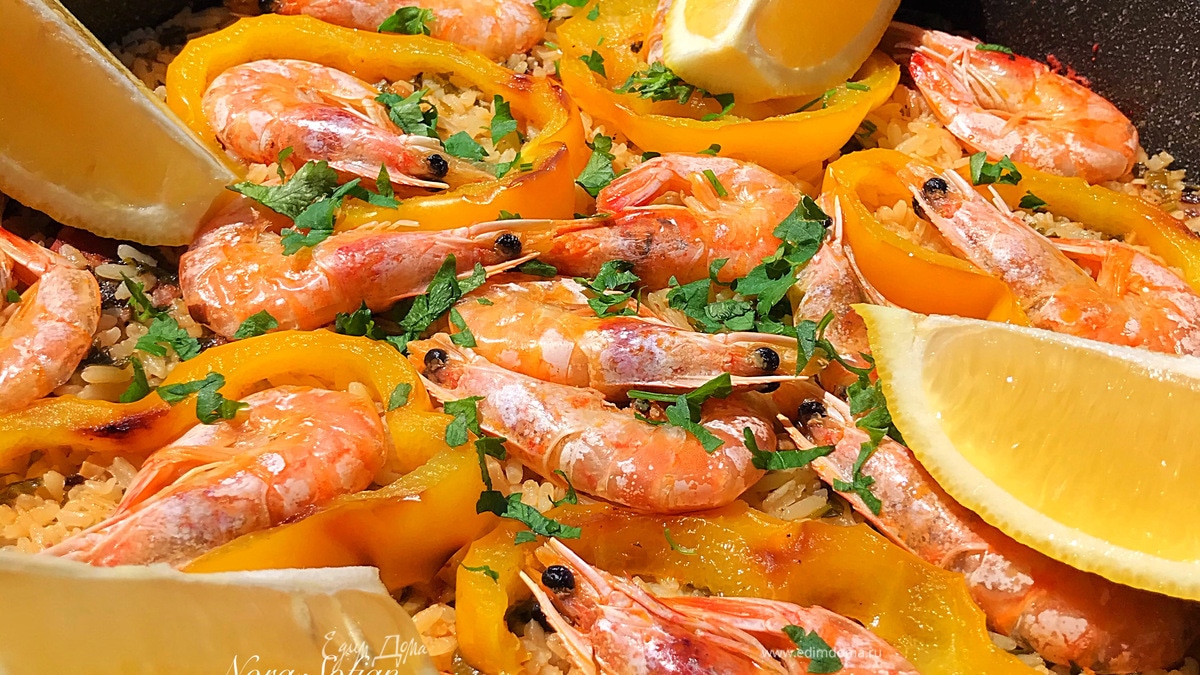 За 5–10 минут до готовности риса (все зависит от того, какого размера у вас креветки) раскладываем сверху болгарский перец, креветки и томим до полной готовности всех продуктов. - Шаг 6