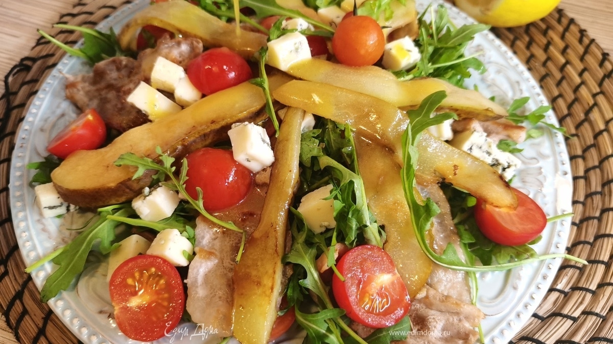 На блюдо выкладываем руколу. Сверху— бекон, грушу, черри и сыр. Смешать ингредиенты для заправки и полить ей салат. Приятного аппетита!
