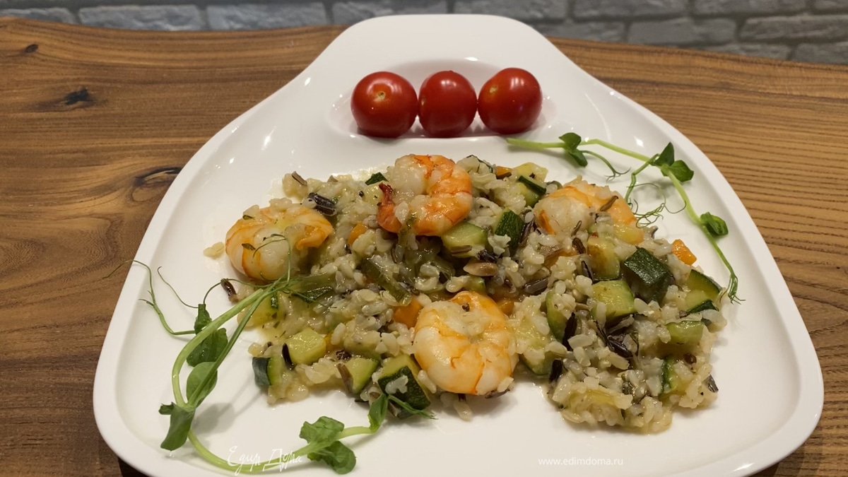 Паэлья с креветками и цукини из смеси бурого и дикого риса.