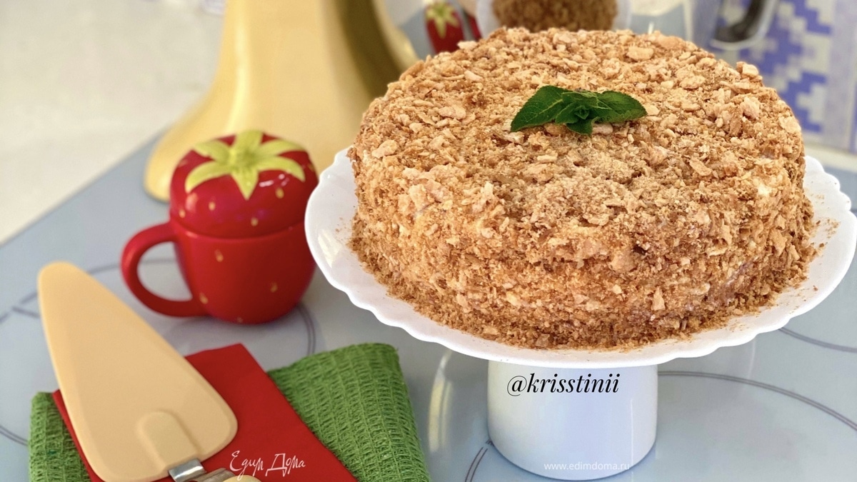 Собираем торт, смазываем коржи соусом, затем — кремом, и так слой за слоем. Посыпать крошкой из остатков коржей. Оставить на ночь в холодильнике для пропитки.