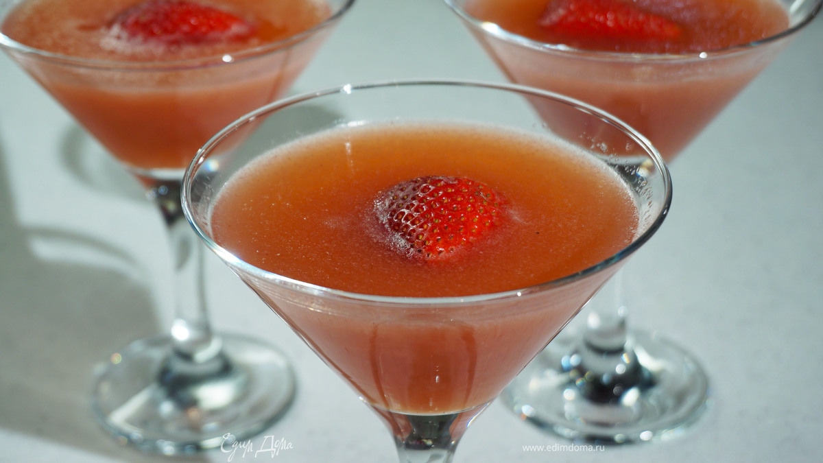 Получившуюся смесь разлить по коктейльным бокалам, оставшуюся клубнику нарезать половинками и выложить сверху. Поставить желе застывать в холодильник на 2 часа.