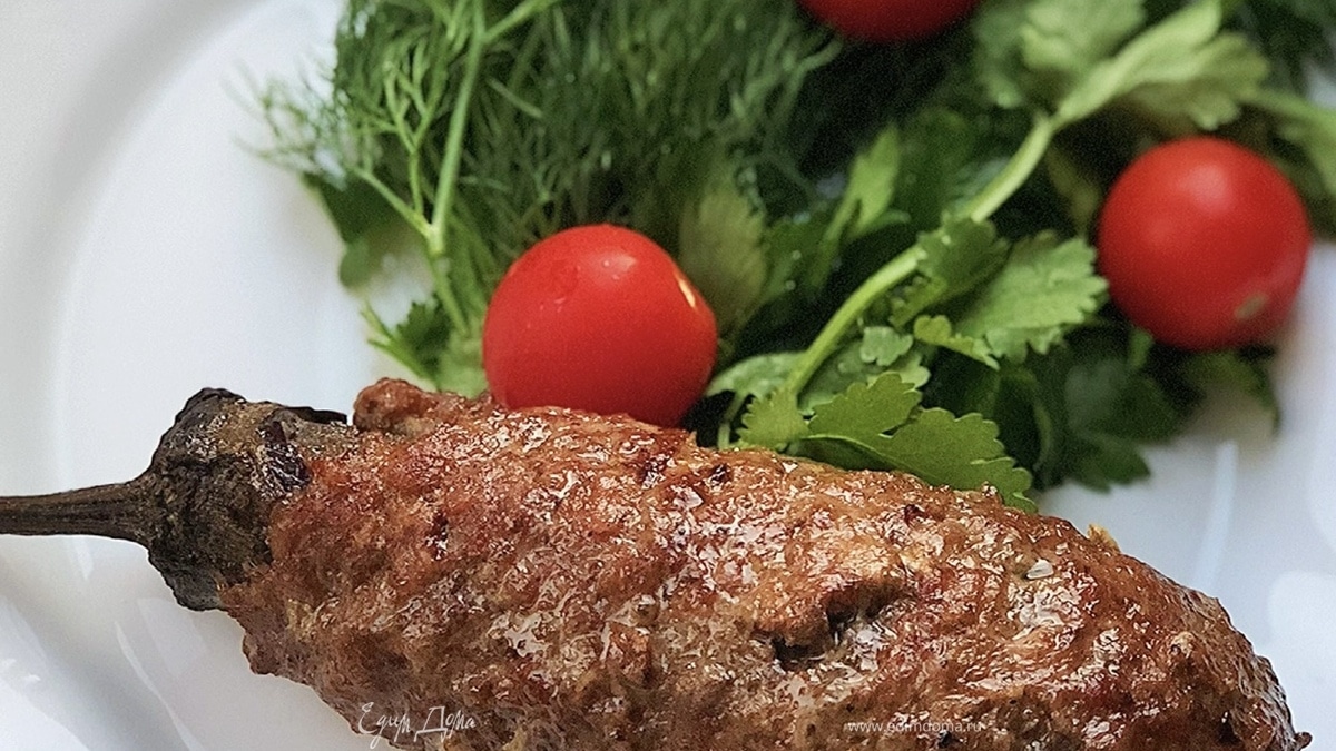 - Шаг 4Раскатываем фарш в лепешку при помощи скалки. Сверху укладываем запеченный баклажан, разрезаем его посередине, внутрь кладем брусочек моцареллы.