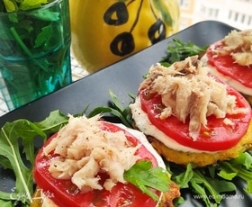 Драники выкладываем на салфетку, чтобы стекло лишнее масло. На тарелку я выложила руколу, сверху — драники, сметану, помидор и рыбу. Поперчила смесью перцев, и готово!