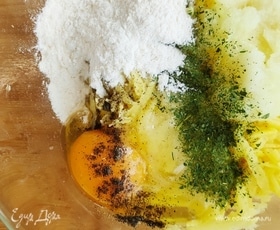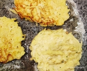 Перемешиваем и выкладываем на хорошо разогретую сковороду (я жарю на растительном и сливочном масле). Обжариваем до золотистой корочки, убавляем огонь и жарим еще примерно по 5 минут с каждой стороны. Нам важно, чтобы картофель внутри прожарился.