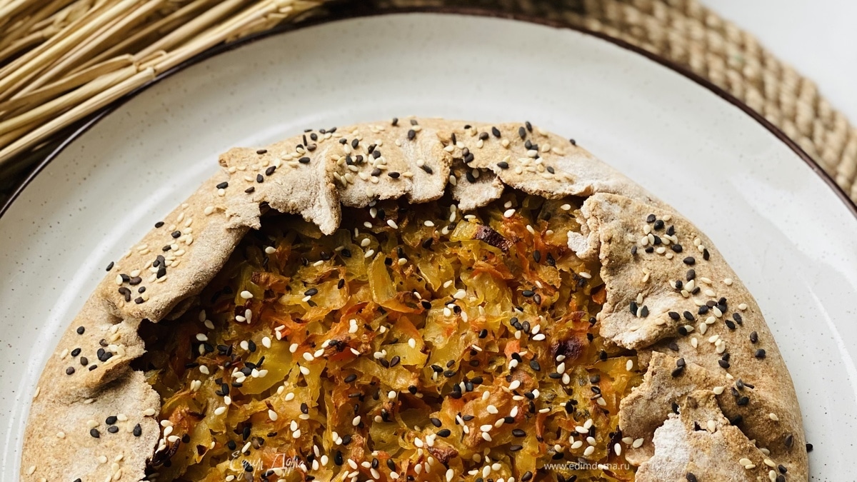 - Шаг 3Тонко раскатываем тесто и выкладываем в середину начинку (от края отступаем где-то 3 см). Формируем галету. Можно посыпать кунжутом.
